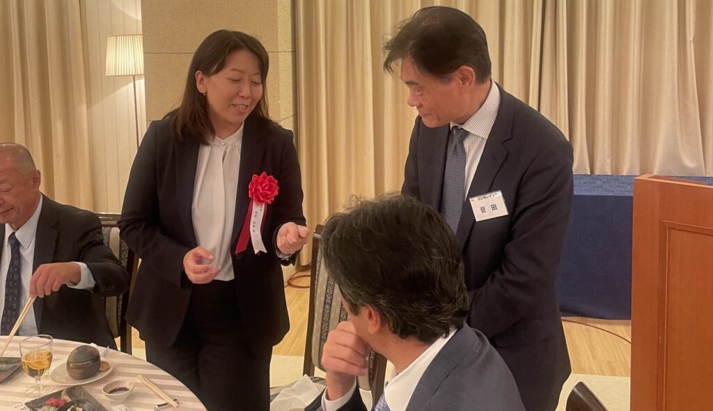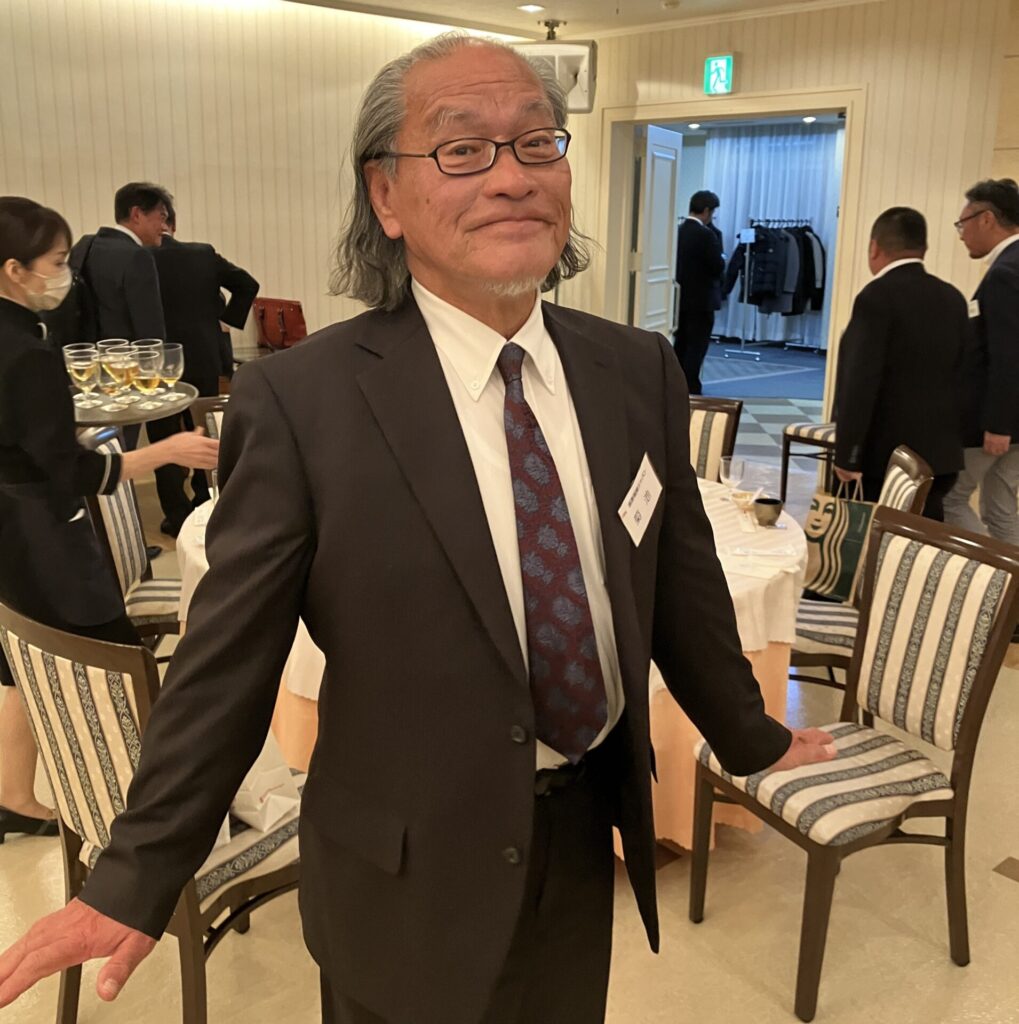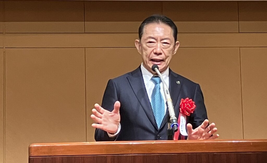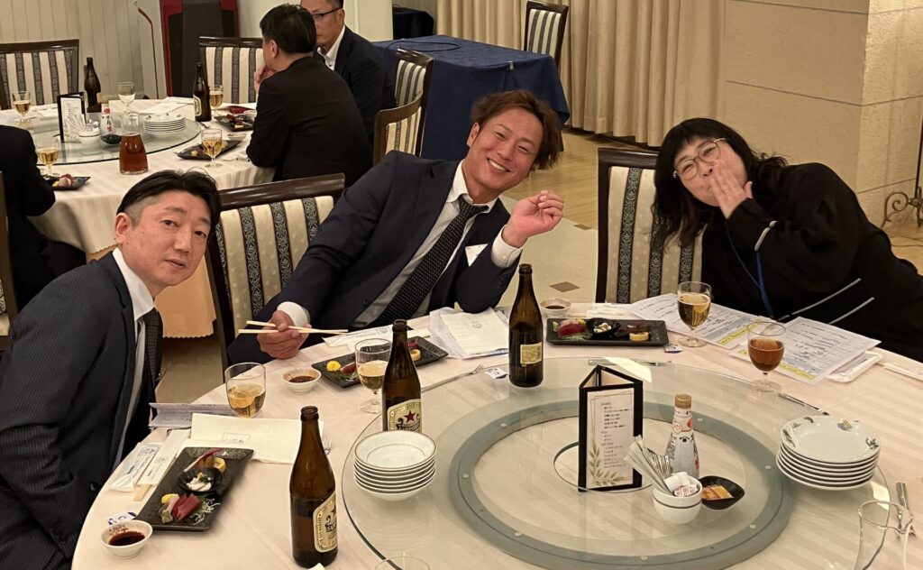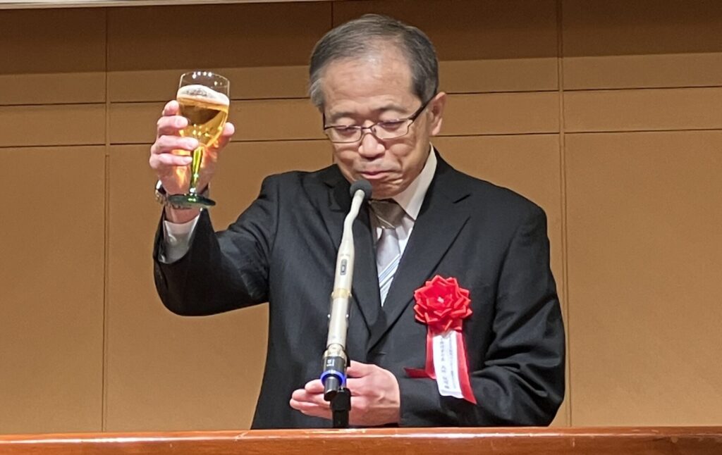 引続いての式典は、11月のチャリティゴルフで集まったチャリティ金の贈呈式です。柏市長と流山市長にご登壇いただき、それぞれの市の近況・ビジョンなどを交えご挨拶をいただきました。そしていよいよ東葛テクノプラザの大竹所長のご発声による乾杯で交流会が始まりました。